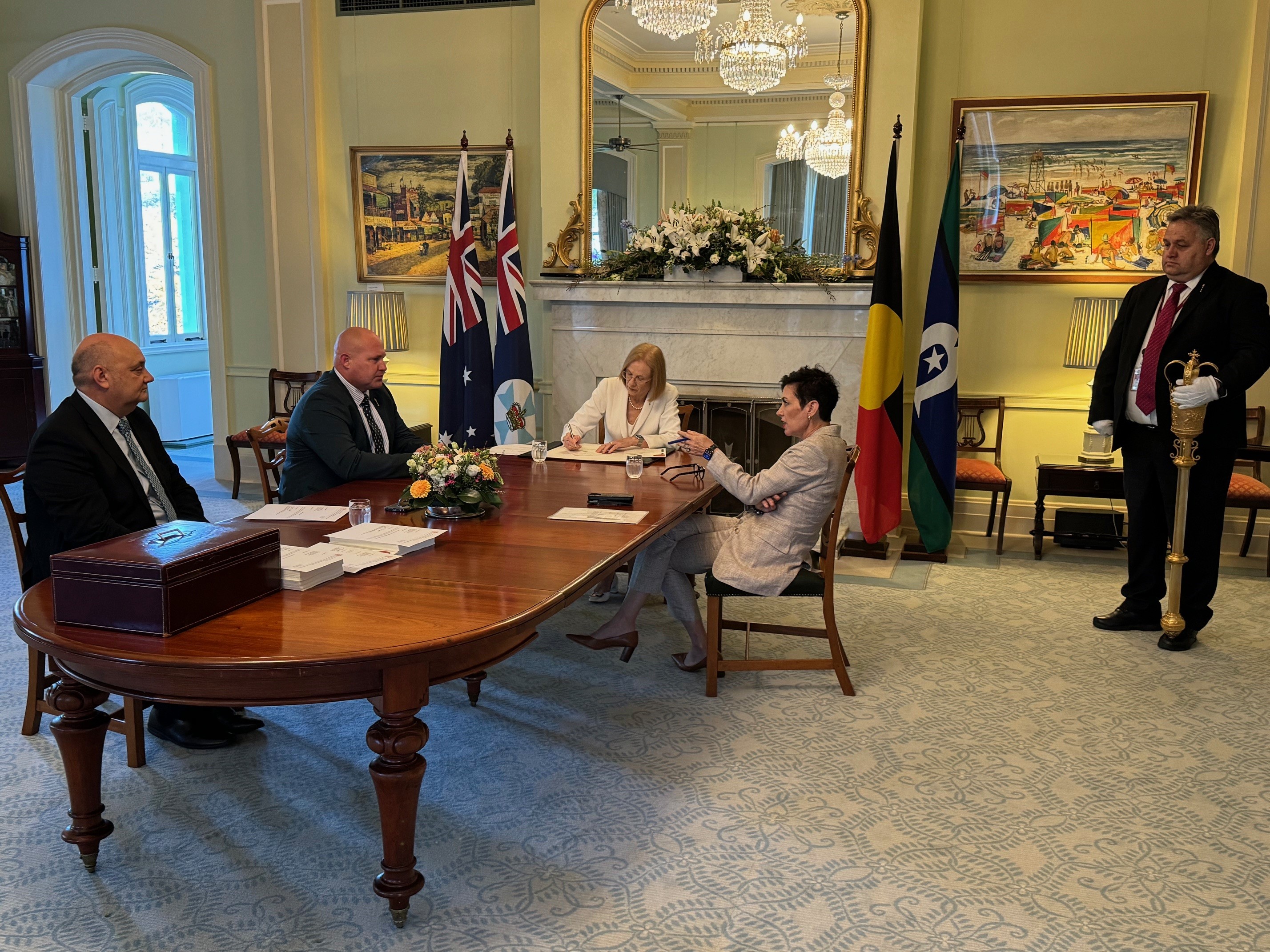 The Governor received the Speaker of the Legislative Assembly, the Honourable Curtis Pitt MP, Clerk of the Parliament, Mr Neil Laurie and Sergeant-at-Arms, Mr Michael Watkin for the presentation of three Bills and two Appropriation Bills for Royal Assent.