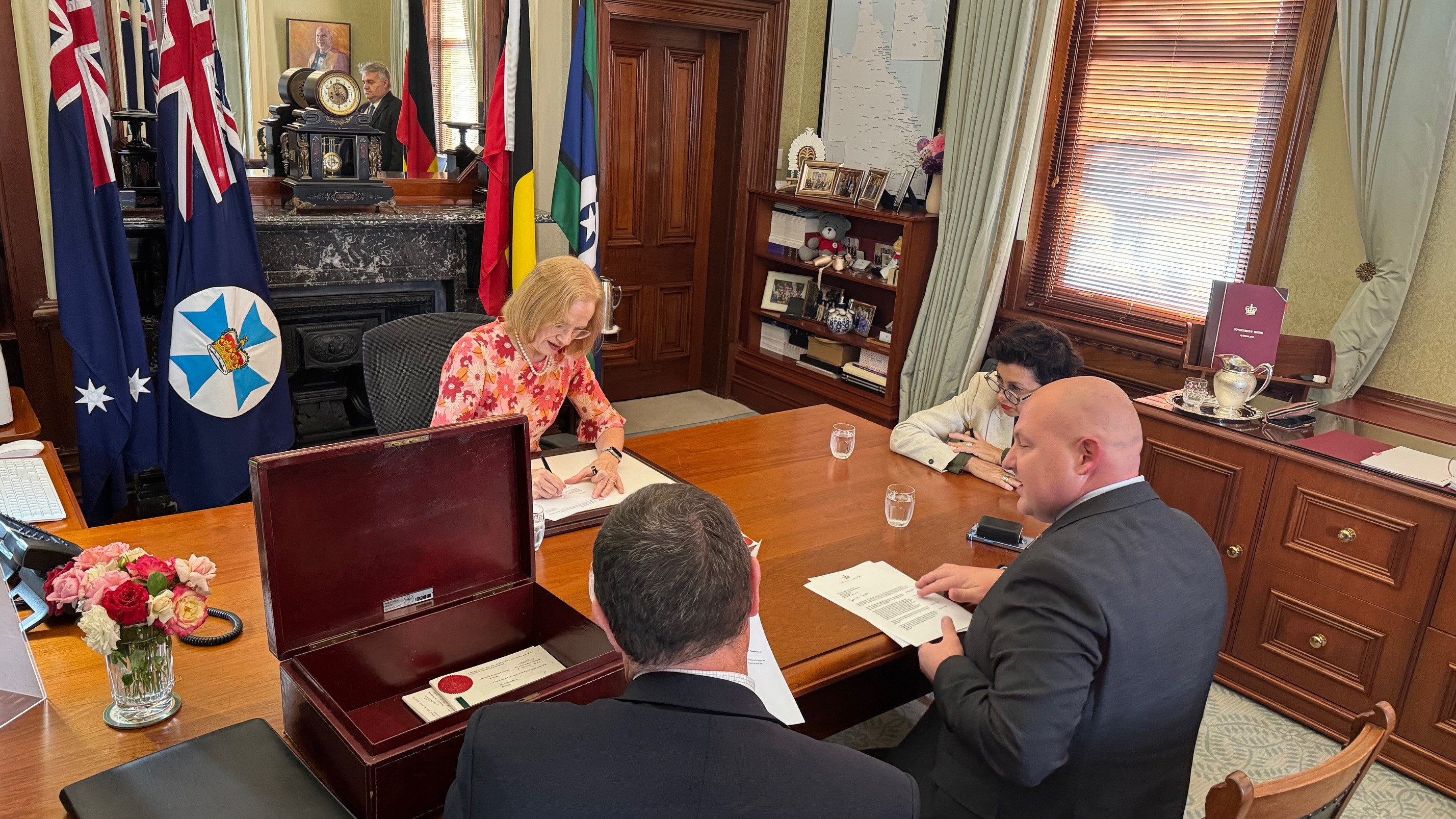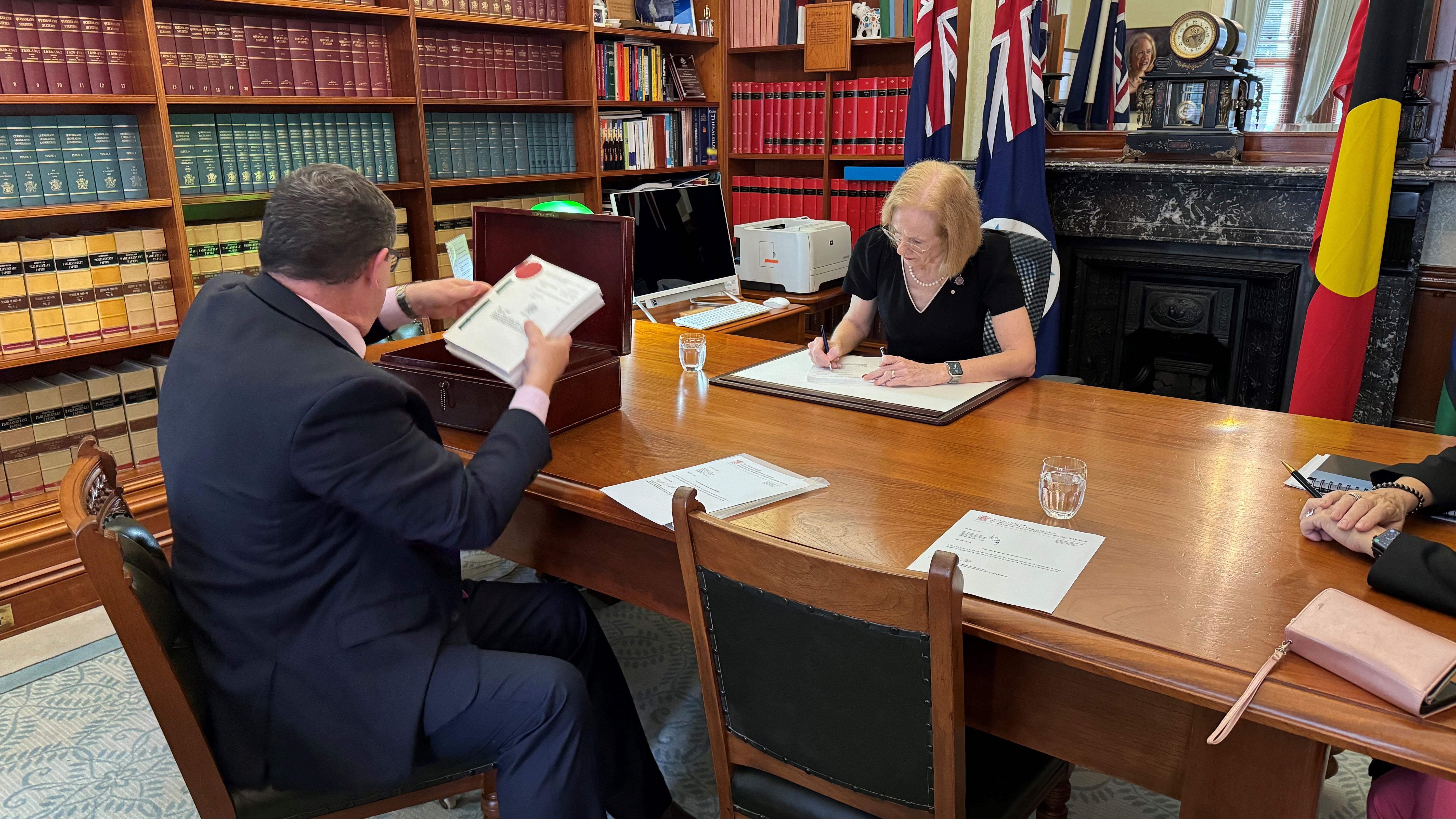 On Monday 18 March, Her Excellency received the Speaker of the Legislative Assembly, the Honourable Mr Curtis Pitt MP, Deputy Clerk of the Parliament, Mr Michael Ries and Sergeant-at-Arms, Mr Michael Watkin for the presentation of one Appropriation Bill and three Bills for Assent.